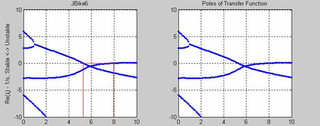 In order to understand what is required for a rider to control a bicycle, it may be useful to apply control theory. One requirement is the linearized equations of motion, which JBike6 can provide. Below is an example of using the equations of motion from JBike6 to create a transfer function which can be analyzed with MATLAB’s Control System Toolbox. The example goes so far as to create a pole-zero map which exactly matches the plot of eigenvalues generated by JBike6.